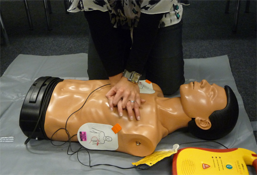 van het praktisch toepassen van hartmassage en beademen op een pop, inclusief het gebruik van de AED. De cursus wordt gegeven in kleine groepen van maximaal